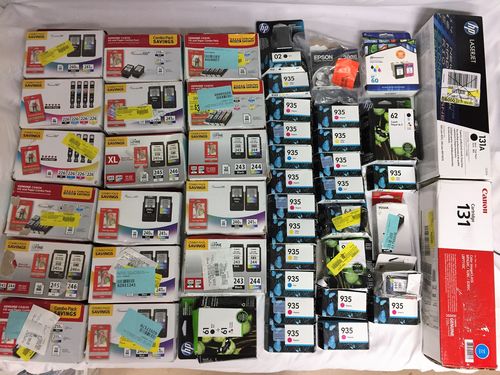 This lot includes different Ink Toners and Cartridges for HP, Canon, Pixma, Epson and More, Please see pictures and manifest. HP 131A toner cartridge is in the original sealed box. All items in this lot are untested, big box store returns. Some packaging may have labels or stickers. Some items may have damaged or missing packaging, missing parts or have technical issues. Sold AS IS.