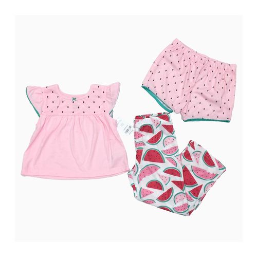 This lot includes 3-piece set includes tee, shorts & pants in Assorted Sizes. Tee: crew neck, flutter cap sleeves, shirred fabric details, bow accent, seed graphics, Shorts: elastic waistband, seed graphics, and Pants: elastic waistband, watermelon graphics. Everything brand new and individually wrapped and labelled.
