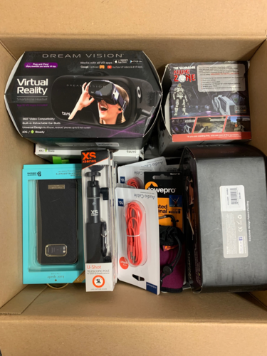 This lot features 75 units of Assorted Premium Small electronics and Fashion Phone cases from Kate Spade, Lowpro, Insignia, and More, new in retail boxes. Samsung Galaxy S8+ Premium Fashion Hardshell case black/gold, Ushot wrist strape for go pro action cameras, Ushot 19inch Steady stick for action cameras, VR headsets with built-in headsets, Black, Insignia 10ft Aux Cables 3.5 mm Red, new, Small Carry All Back Packing device holder, small, maroon, and Rebecca Minkoff Samsung Galaxy S8 Silver Glitter Fall Case.