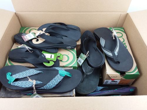 This lot contains exclusive Chaco shoes in various styles, models, and sizes for men and women. All of the shoes are brand new and in their original packaging (retail-ready).