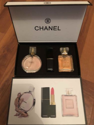 This lot includes 3 pcs Gift Sets by Chanel. The box includes one Lipstick and two Perfume Sprays. All items are brand new and retail-ready.