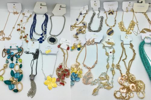 This lot includes 50 pieces of Amazing Brand Name Necklaces from Dressbarn, Sophia + Kate, Catherines, & More. Every box is different and 80% different styles - very little Repeats. All Designer names as pictured. 100% of Necklaces are Name Brands. These are some of the best variety and best quality we have ever purchased! All Assorted Brand Names: Charming Charlie, Catherines, Signature NYC, Sophia + Kate, Dressbarn, Mix it Color, and More. Each necklace is individually bagged. Every piece will have Retail tags and every piece is Pre -Priced. NO JUNK- ALL QUALITY NECKLACES. All new - not store returns.
