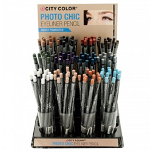 This lot contains 6 packs of City Color Photo Chic Eyeliner Pencils Displays. Each display has 144 Eye Pencils and the total Eye Pencils are 864 pieces. All items are brand new and ready for retail.