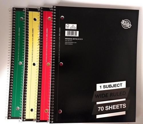 This lot includes 400 pcs of 1 Subject, Wide Ruled, 70 Sheets College Notebooks with Spiral Bound and Tearable Sheets from Norcom Inc. Notebooks available in Black, Red, Green and Yellow outer colour binding. All items are new and retail-ready.