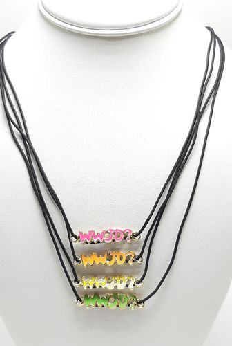 This lot contains Colorful Enamel Pendant WWJD? What Would Jesus Do? Cord Necklaces. These colourful enamel over metal WWJD? Necklaces come in 4 Colors (3 Green, 3 Orange, 3 Pink and 3 Yellow per dozen) They are brand New. The pendants measure 1 1/2" wide.