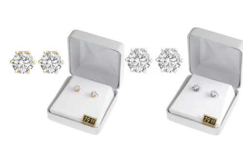 This lot includes 50 PAIR OF 2 Carat ( 6mm) Cubic Zirconia Earrings in a Beautiful White Leatherette Gift Box. Earrings set in 6 prong basket setting. 25 pair in 14 kt Gold Overlay + 25 pair in Sterling Silver overlay. Hypoallergenic post. Nickle + lead-free.