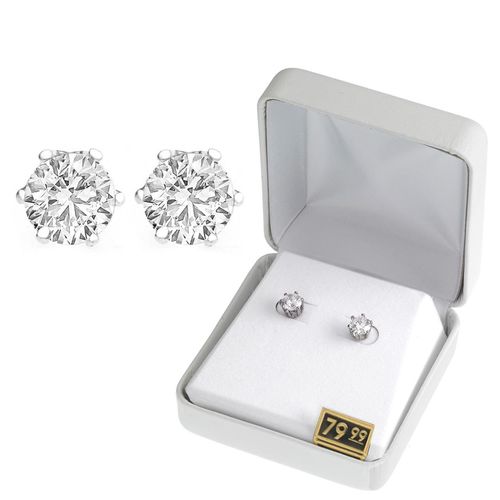 2 Carat ( 6mm) Cubic Zirconia Earrings in a Beautiful White Leatherette Gift Box. Earrings set in 8 prong basket setting. 25 pair in 14 kt Gold Overlay + 25 pair in Sterling Silver overlay. Hypoallergenic post. Nickle + lead-free.