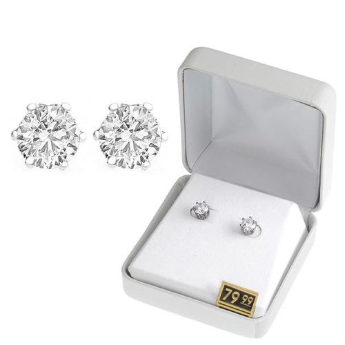 This lot includes Cubic Zirconia Earrings in Beautiful Gift Box- 2 Carat T.W. 2 Carat total weight ( 6 mm each stone ) Cubic Zirconia Earrings in a Beautiful White Leatherette Gift Box. Earrings set in 6 prong basket setting. 25 pair in 14 kt Gold Overlay + 25 pair in Sterling Silver overlay. Hypoallergenic post. Nickle + lead-free.