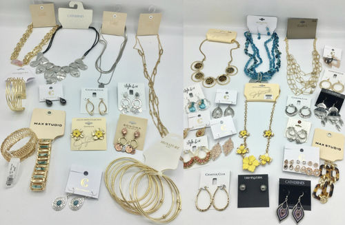This lot includes 50 pieces Brand Names + Dept store Jewelry. Jewelry is Brand New!! - All jewelry is individually bagged. 100% of the Jewelry will have retail tags on them. Assorted styles of Necklaces, Earrings + Bracelets. All the Current Styles. 100% Of Jewelry will be Brand Names: Charming Charlie, 14th & union - Nordstrom , Jaclyn Smith , New York & Company, Ashley Stewart, Catherines, Signature NYC, Studio S, Dressbarn, Color- JC Penny , +Bloomingdale's. Excellent lot for Resellers - Boutiques- Stores.