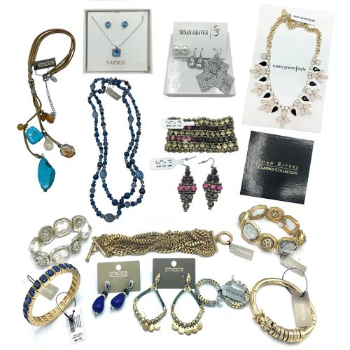 This lot includes 100 units of Top Designer + Name Brand Jewelry. Chico's, Cache, Coldwater Creek, Napier, Monet, Susan Graver-QVC, Joan Rivers. Jewellery that sells on Websites such as eBay and more. This lot will hold 100 pieces of Jewelry all is Genuine and Has Tags. All Brand New. NO JUNK- All Highest Quality Jewelry. Each piece is Boxed or individually bagged. See the manifest for more details and break down