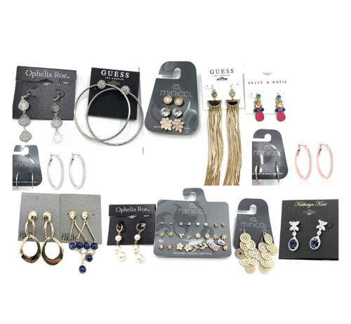 This lot includes 50 Pairs of Earrings Designer Name Brand. No duplicates. Erica Lyons, Macys, Nordstrom, Daisy Fuentes, Guess, Minicci, Kelly and Katie, Avenue, Zaxie, INC etc