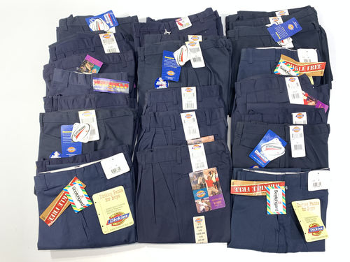 This lot includes 32 Dickies Boy's Flat Front Navy Pants Classic Fit and Boot Cut in assorted sizes. Included Sizes: 10, 12, 13, 14, 16, 18, and 20. All items are Brand New.