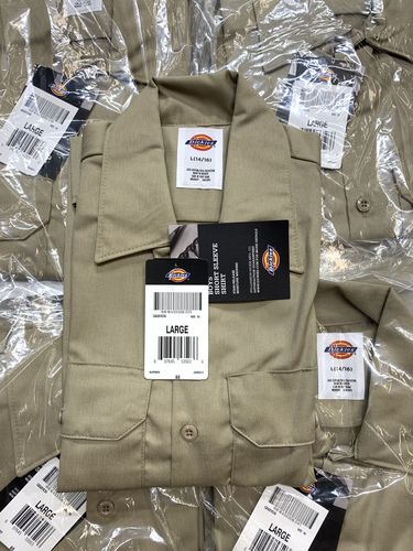 This Lot includes 30 Dickies Boy's Short Sleeve Work Shirt. Boy's Size Large. Colour: Khaki Desert Sand. Condition: Brand New. Genuine Original Dickies Shirts.