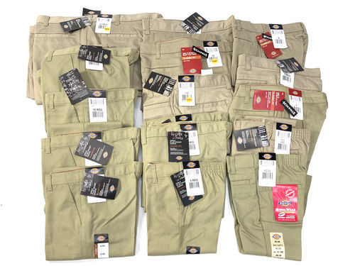 This lot includes 18 Dickies Stretch Girls Flat Front Khaki Pants Classic Fit and Boot Cut in assorted sizes. Included Sizes 3, 4, 5, 0, 1, 8, 10, 12, 13, 14, and 21. All items are Brand New.