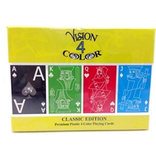This lot includes 80 Double Deck Plastic Playing Cards by Vision 4 Color. Cards come in four colours and Units come packed 80 double decks to a case. All items are brand new and ready for retail.