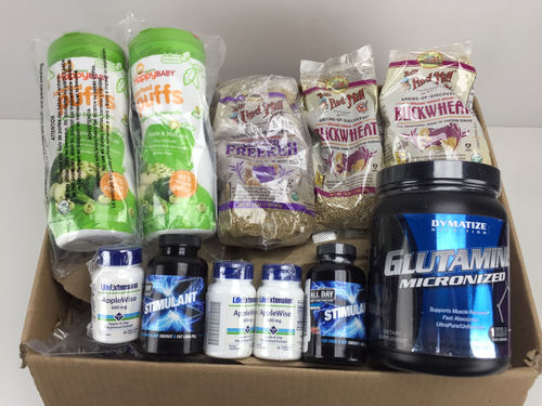 This lot features different supplements and health items from Dymatize, Frontier, Atkins, and more. All of the items are in new condition.
