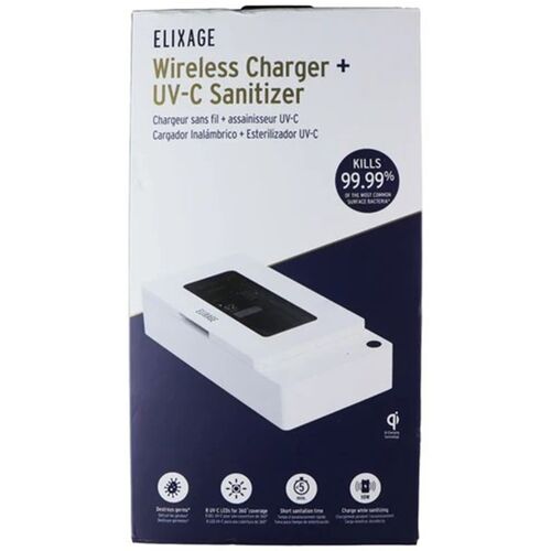 This lot includes 30 Elixage Wireless Charger + UV-C Sanitizer for Smartphones & More. New in box. Features: Window to view phone notifications, Sanitize other items, LED status indicator lights, Spacious capacity fits most phones, Auto safety shut-off, Eco-friendly UV-C LEDs, and USB-C wall charger included.