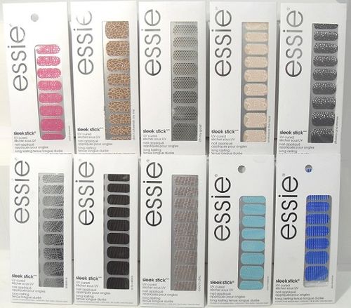 This lot includes Essie Sleek Stick UV Curved Nail Applique Long Lasting Nail Stickers in Assorted Colours and Designs. All items are brand new and ready for retail.