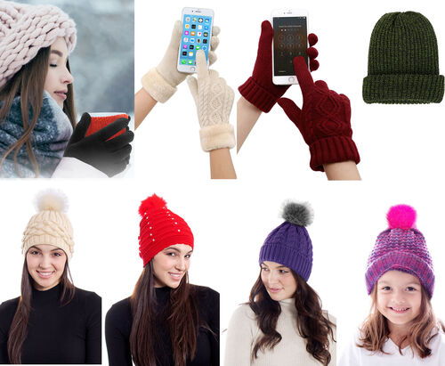 This lot includes Fingerless Gloves, Winter hat beanies, Touch Gloves Knit Pom Hat.