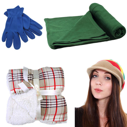 This lot includes Fleece Gloves. Sweatshirt Blanket_50" x 60". Lambswool Microsherpa Plaid Throw_50" x 60". and Beanie Hat. Drop Leg Utility Bag_adjustable_Bag Size: 7.5"W X 8"H X 4"T