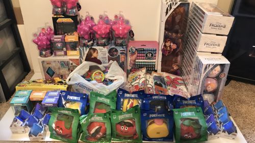 This lot includes many new & shelf pulled toys including Fortnight Bitty Boomer Bluetooth Speakers, Fortnight Squishees, Frozen II various toys, and various wall decals. Shelf pulls may have a bit of sticker residue but all sealed and in new condition. Most everything is in new and retail-ready condition.