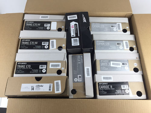 This lot contains Giro, Altra, and OluKai shoes in various models, styles, and sizes. All of the items are brand new and in their original packaging (retail-ready).