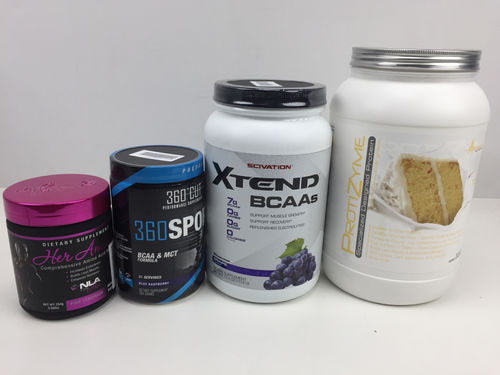 This lot includes various health and lifestyle supplements from Glycoload, Dymatize, Activana, and more. All of the items are new, have expiration dates in 2019, 2020, and further, and retail-ready.