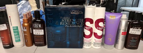 This lot contains a variety of hair salon products from brands such as ALEK, American Crew, ANDY, bbCos, TIGI, Goldwell, Joico, LA Biosthetique, and more. All items are shelf pulls. Contains products such as conditioners, shampoos, hair treatments, developers, and more. See the manifest for products breakdown.