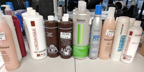 This lot contains a variety of hair salon products from brands such as Alva, Goldwell, Iden, Joico, Kadus, L'Anza, Paul Mitchell, Rusk and more. All items are shelf pulls. Contains products such as conditioners, shampoos, hair treatments, developers, and more.