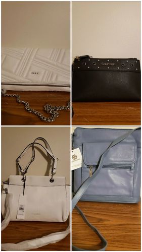 This lot includes handbags and accessories from Michael Kors, Calvin Klein, Giani Bernini, DKNY, and Danielle Nicole. Most items come with original tags but may have store labels on the tags.