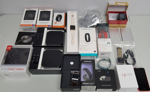 This lot contains one box of Salvage grade electronics like Headphones, Apple TV, Activity Trackers, Smartwatches, and More from brands such as Apple, Garmin, Fitbit, LG and more. There are 20 pieces included in this lot. All items are salvage and sold as is. See the manifest for products breakdown.