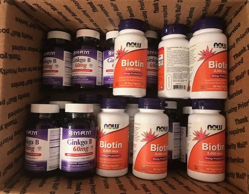 This lot includes18 units of Ginkgo B 60mg/60 capsules by MRM and Biotin 5000mcg/60 capsules by NOW Foods. All items have expiry in 2019. All items are brand new and retail-ready.
