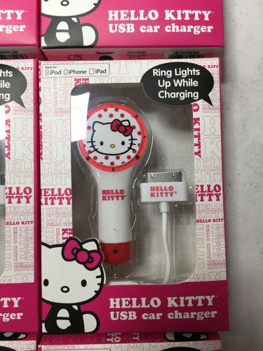 This lot includes 1764 units of aftermarket Hello Kitty - USB Car Chargers + Bonus 30-Pin Cables. Each pack contains 2x Units : Charger + Cable. All items are new and retail-ready.