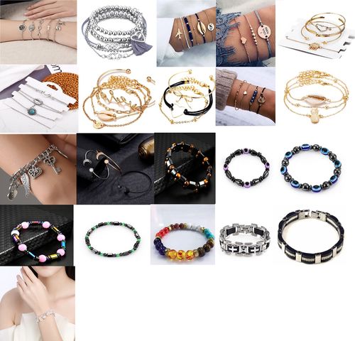 This lot includes 75 units of assorted High-Quality Bracelets as shown. A great mix of styles, the buyer will receive 1-4 of each unit shown. A few are silver plated, some are stainless, some are beads. All the ones shown in the picture is what you will get. All items are new, in sealed packs, and ready for retail.