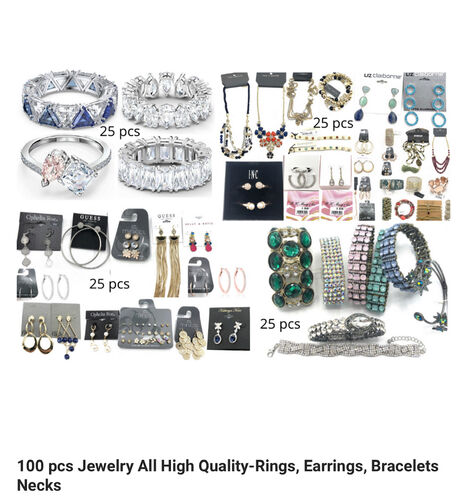This lot includes 100 pcs of Jewellery. All High Quality-Rings, Earrings, Bracelets Necks. You will receive 25 assorted pieces of Swarovski Elements Rings. 25 pcs assorted Designer & Name Brands necklaces & boxed jewellery. 25 pairs of assorted Designer & Name Brands Earrings. 25 assorted High-Quality Bracelets. Total 100 pcs. Some Names include Chico's, Liz Claiborne, Guess, Lane Bryant, Minicci, GBG, INC, Kelly + Katie, Avenue, Christian Siriano, Charming Charlie RSVP, Macy's, Nordstrom, Jaclyn Smith, New York + Company, Style& Co, A&I, Mix It by JCPenny, Rachel Roy, Bold Elements by JC Penny, Ballet, Target, Sophia & Kate, Kim Rogers Dressbarn, +. Ect. It excellent lot for Resellers - Boutiques- Stores.