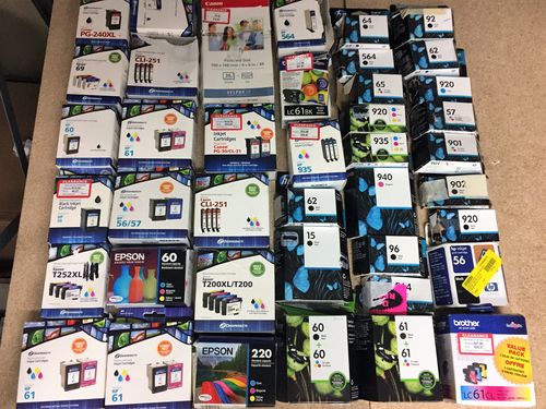 This lot features different Ink and Toner Cartridges for HP, Epson, Canon, Brother, and More. Please see pictures and manifest. All items in this lot are untested, big box store returns. Some packaging may have labels or stickers. Some items may have damaged or missing packaging, missing parts or have technical issues. Sold AS IS.