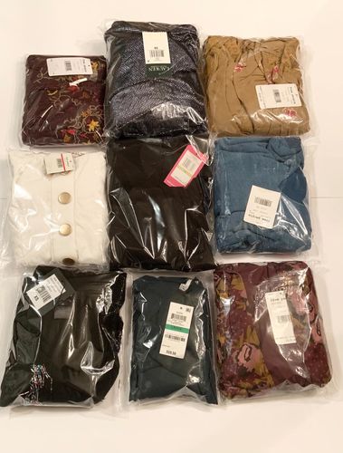 This lot includes 20 assorted pieces of women's clothing. Each piece will be different. Brands include Free People, Bar III, Maison Jules, Vince Camuto, & More. Each item comes folded and bagged, ready for online sales.