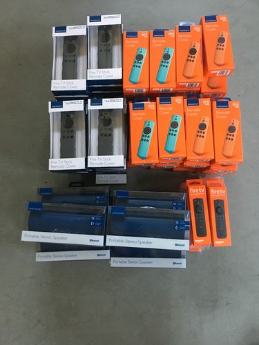 This lot includes Alexa Voice Remote with Power and Volume Controls, Fire TV Stick Remote Covers, and Insignia - WAVE 2 Portable Bluetooth Speakers. Fire TV Stick Remote Covers are in Gray, Teal, and Orange Colour. All items are brand new and ready for retail. See manifest for products breakdown.