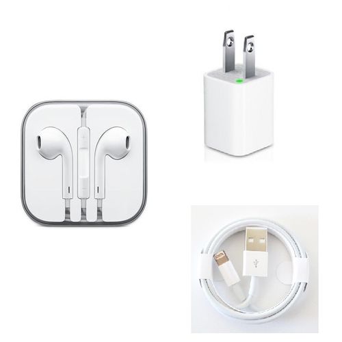This lot includes different aftermarket USB Cable, Wall Charger Adapters, & 3.5 mm Earphone in white colour for iPhone devices with crystal packaging. All of the items are new and retail-ready.