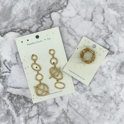 This lot includes earrings, rings, and bracelets. All items are new and in original packaging. Wanderlust & Co. Multi Helix Earrings fuses orbital shapes, elongated lines, and juxtaposed sizes on a drop design. Gold: Crafted from stainless steel and coated in 18K gold gilt. Silver: Crafted from stainless steel and coated in rhodium. --Wanderlust & Co. Multi Helix Ring features a myriad of linked and overlapping orbital shapes and lines to create a three-dimensional statement piece. Size 7. Gold: Crafted from stainless steel and coated in 18K gold gilt. Silver: Crafted from stainless steel and coated in rhodium. -- Jesse and Co., a limited run, San Diego-based jeweller. Textured Intertwining Ring, Handcrafted in pewter, Available in Antique Silver dipped or 14kt gold dipped, Will adjust to size 5-8, Made in California. -- Jesse and Co. Hammered Bracelet, This delicate and beautiful hammered bracelet will add to any bracelet stack or even by themselves.