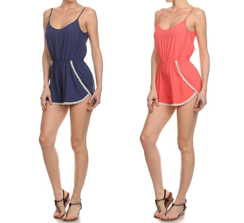 This lot includes 80 units of Junior's Solid Color Pompom Short Sleeveless Romper in Coral and Washed Navy. All items are guaranteed to be authentic, brand new and ready for retail. Specifications are Material:100% Rayon. Size: L. Chest: 38". Waist (relaxed) 23" (full circ.). Waist (stretched) 32" (full circ.). Hip: 40" (full circ.). Front Rise: 12". Bk Rise: 13.5". Upper Body Length: 19" and Lower Body Length: 13".