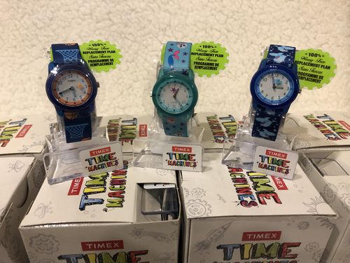 This lot includes 24 Kid's Timex Time Machine Nylon Watches, listing as Shelf Pulls as they are all in their original packing with instructions included however their batteries need replacing. Lot contains 24 all kid's Timex Time Machine nylon watches in different types of styles. Don't miss out! Case size: 28 mm. Scratch-resistant crystal. Water-resistant: 3 ATM - 99 feet- Resistant- Not recommended for swimming or submersion. Movement: Quartz.