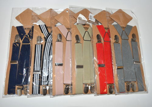 This is a 50 piece lot of clip-on suspenders for kids. Colors/Quantity: - Dark Blue: 3 - Light Blue: 17 - Black and White Stripes: 21 - Beige: 9