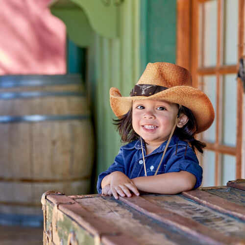 This lot includes Kid's cowboy or cowgirl straw hats with shaped, upturned brims, and teardrop creases. Some designs come in 2-toned woven straw designs! Your kids will love the beaded detailing with a butterfly or oval shape accent that wraps around the entire hat. Material: Synthetic Straw. Size: Circumference About 21.7", Height 4.25", Brim 3".