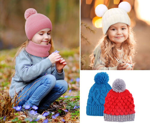 This lot includes assorted Kids Pom Pom Beanie Faux Fur Ball Warm Lined Knit Winter Hats.