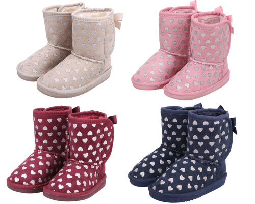 This lot includes Kids Shimmer Faux Suede Sherpa Winter Boots. These faux suede kids' boots are a classic winter style with added charm. They feature a sassy foil heart pattern for a sparkly sweet look and sherpa on the inside for supreme warmth and comfort. A relaxed fit makes them a breeze to put on and remove, and the rubber soles and high-quality stitching ensure they won't wear out. These boots are perfect for any little princess who wants to look as cute as can be while staying warm and toasty. Size Toddler 8: Inside Length: 6.6” shaft:5.3” Size Toddler 9: Inside Length: 6.9” shaft:5.5”. Size Toddler 10: Inside Length: 7” shaft:5.7”. Size Little Kid 11: Inside Length: 7.4” shaft:5.9”. Size Little Kid 12: Inside Length: 7.6” shaft:6.1”. Size Little Kid 13: Inside Length: 7.9” shaft:6.3”. Size Little Kid 1: Inside Length: 8.4” shaft:6.5”. Size Little Kid 2: Inside Length: 8.7” shaft:6.7 ”. Size Little Kid 3: Inside Length: 8.9” shaft:6.9”.
