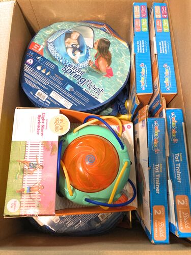 This lot includes children's' summer water toys, sprinklers, swim boards, floats and many other items perfect for hours of children's summer outdoor time. All items are shelf pulls, they all work, in their original packaging. There may be some box/package handling, places where stickers were removed or other small imperfections.