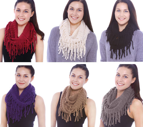This lot includes Knit Pattern Infinity Scarf with Tassels Crochet Circle in Assorted Colours. Soft and fashionable, great for fall-winter season tassel knitting scarf Ultra-light and comfortable to wear must-have item. The plush circle scarves are perfect for a chilly winter day. With many options on how to wear these accessories, they can be worn hung around the neck once, or wrapped twice around the neck for a snug fit, or even over the pack of your head for a shawl effect. With plenty of colours to choose from, you will be happy to add this to your wardrobe. Material: Acrylic and Size: 23.6" x 11.8". NOTE:NO AMAZON SALE