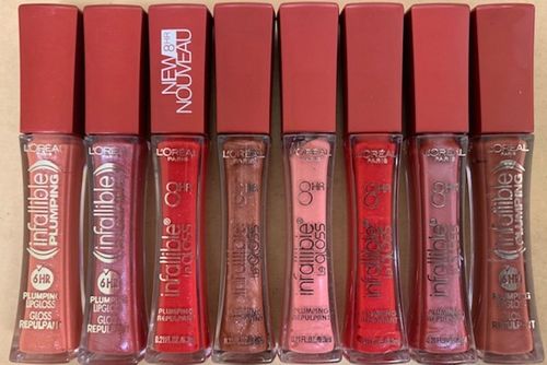 This lot includes L'Oreal Infallible 6hr & 8hr Lip Glosses in Assorted Shades. All items are in shelf pulls condition.