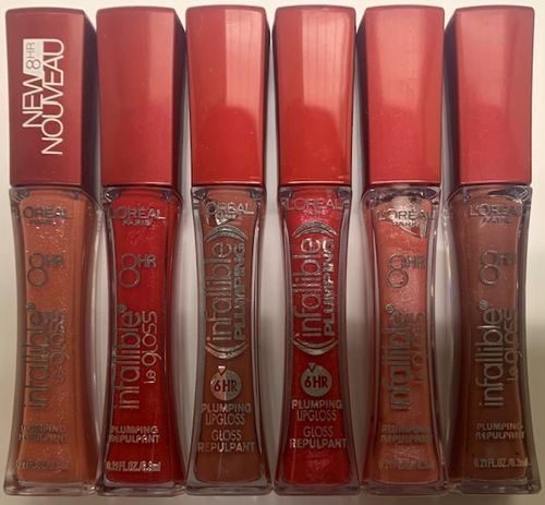 This lot features L'Oreal Infallible Le Gloss 6hr & 8hr Plumping Repulpant in Assorted Shades. All items are shelf pulls in condition.